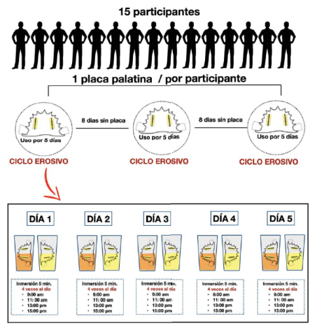 Todos los voluntarios elegibles fueron identificados por un número único de estudio. Se les asignó al azar un orden de tratamiento de secuencia de acuerdo con el orden de entrada en el estudio. La asignación al azar se determinó a partir de una tabla de asignación estándar al azar. Los especímenes fueron distribuidos aleatoriamente a los diferentes grupos experimentales y codificados. La placa palatina fue instalada la noche anterior al inicio de la fase experimental, después de la última higiene y antes de dormir para propiciar la formación de película adquirida. El segundo día las placas acrílicas fueron expuestas a las bebidas, 4 veces al día en horarios predeterminados (9:00 am, 11: 00 am, 13:00 pm y 15:00 pm) de la siguiente forma: El dispositivo se retiró del paladar y fue colocado dentro de un recipiente que contenía una bebida durante 5 minutos, se procedió a lavar con agua destilada desionizada y se sumergió el otro lado del dispositivo en otra bebida durante 5 minutos, luego se procedió a lavar con agua destilada e inmediatamente fueron recolocados en la boca. Estos dispositivos fueron usados diariamente, inclusive para dormir, excepto durante los horarios de alimentación (desayuno, almuerzo y cena). Después de cada fase experimental hubo un periodo de washout de 8 días para evitar cualquier efecto cruzado entre las bebidas y de descanso para los voluntarios. Seguidamente cada grupo fue expuesto a diferentes bebidas siguiendo los mismos procedimientos y tiempos (17) (Figura 1).