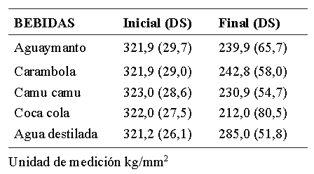 Los valores de microdureza superficial del esmalte inicial y final de acuerdo a los jugos utilizados se observan en la Tabla 1. Los cuatro grupos experimentales disminuyeron significativamente la microdureza superficial del esmalte (p<0,05), sin diferencias significativas entre ellos (Gráfico 1).