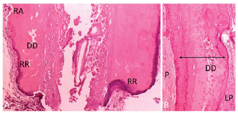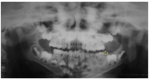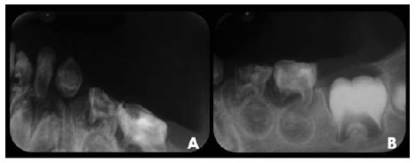 A OR pode acometer isoladamente os dentes decíduos quanto os permanentes, assim como afetar ambas dentições. Existem alguns relatos de caso na literatura que descrevem que a OR acomete um dente (15), outros dois dentes (14, 16), quatro dentes (14), todos os dentes de um quadrante (18-21), até todos os dentes mandibulares (17), bem como os sucessores permanentes, no caso em que se presente esta condição em dentes decíduos. No presente caso, os dentes acometidos pela OR foi todo o terceiro quadrante de dentes decíduos e os dentes sucessores permanentes.