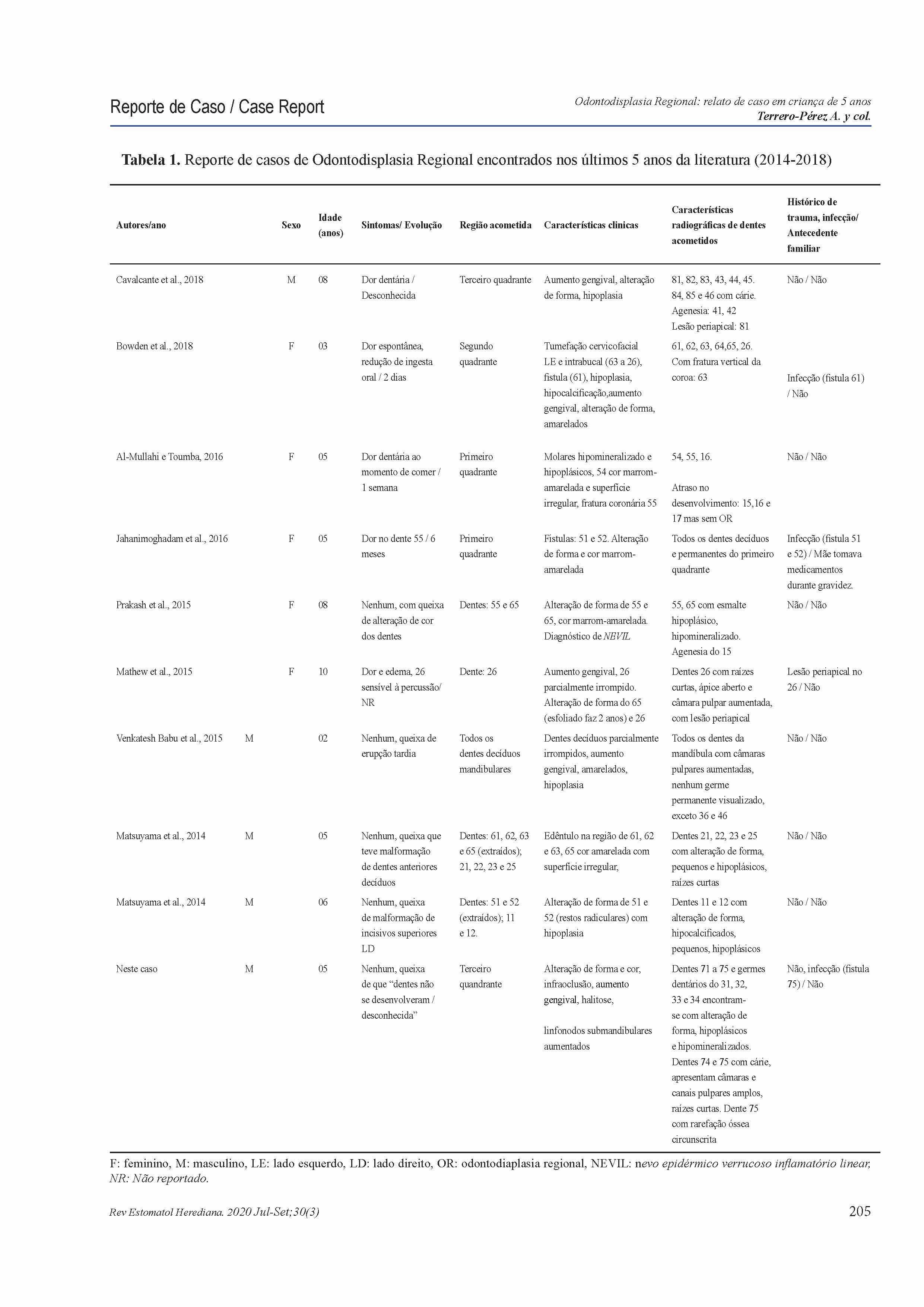 Nos últimos 5 anos foi realizado um levantamento na literatura dos casos clínicos publicados (tabela 1). As principais características clínicas relatadas são presença de dentes hipomineralizados, dentes com cor marrom, acastanhados ou amarelados, fistulas, tumefação cervicofacial e intrabucal, decíduos parcialmente irrompidos, gengivite, etc (14-21).