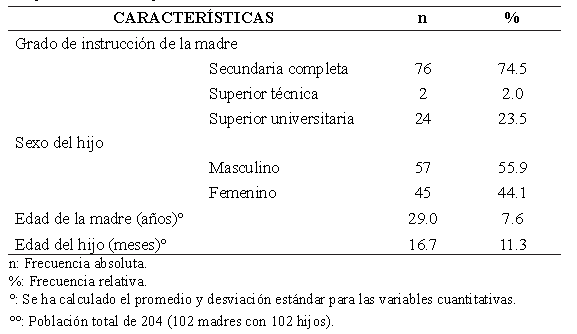 El presente estudio se realizó en los meses de noviembre y diciembre del 2014 en el Centro de Crecimiento y Desarrollo-Lactancia Materna del HNCH, Lima- Perú. El análisis se realizó sobre una muestra de 204 sujetos, siendo 102 madres y 102 niños. De los niños, 55.9% fueron de sexo masculino y el 44,1% femenino. De las madres, 74,5% habían terminado la secundaria completa y 23,5% educación superior. En cuanto a las edades, en las madres se tuvo una media de 29 años y en sus hijos de 16.7 meses (tabla 1)