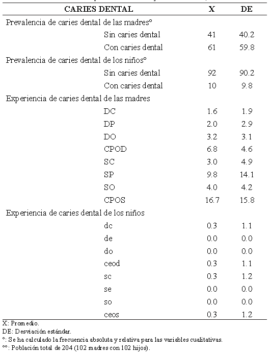 En cuanto a la prevalencia de caries dental, el 59.8% presentó lesiones de caries dental en las madres y 9,8% en los niños. En experiencia de caries dental, se encontró en las madres un CPOD promedio de 6,8 (DE=4,6) y un CPOS promedio de 16,7 (DE=15,8). En los niños se encontró que el índice ceod y ceos promedio de 0,3 en ambas (DE=1.1 en el ceod y DE=1.2 en ceos) (tabla 2).