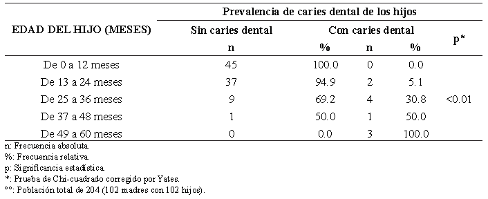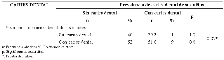 Por otro lado, encontramos que el 39,2% de madres sin caries dental tenía también hijos sin caries dental y el 1% hijos con caries. En cuanto a las madres con caries dental, el 51% tenía hijos sin caries dental y el 8.8% hijos con caries (tabla 3).