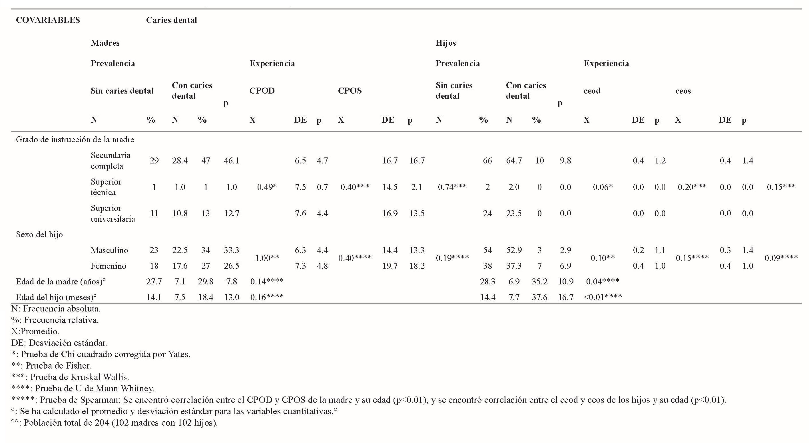 En cuanto a la prevalencia de caries de las madres, las madres sin caries dental tuvieron una edad promedio de 27,7 años (DE=7,1) y sus hijos de 14,1 meses (DE=7,5). Además, el 28,4%, 1% y el 10,8% tuvieron educación secundaria, superior técnica y universitaria, respectivamente. El 22.5% de madres sin caries dental tenían hijos y el 17,6% hijas. Las madres con caries dental tenían una edad promedio de 29,8 años (DE=7,8) y sus hijos unos 18,4 meses (DE=13). Además, el 46,1%, 1% y el 12,7% tenían educación secundaria, superior técnica y universitaria, respectivamente. El 33,3% de madres, hijos de sexo masculino y el 26.5% de sexo femenino. Por otro lado, de los hijos sin caries dental, 52,9% fueron de sexo femenino y el 37,3% de sexo masculino, tuvieron una edad promedio de 14.4 meses (DE=7,7) y madres con una edad promedio de 28.3 años (DE=6,9). Y el 64,7%, 2% y 23,5% de sus madres tenían educación secundaria, superior técnica y universitaria, respectivamente. Los hijos con caries dental, fueron el 6,9% de sexo femenino y el 2,9% de sexo masculino, tuvieron una edad promedio de 37,6 meses (DE=16,7) y madres con un promedio de 35,2 años (DE=10,9). El 10% de las madres con hijos con caries tenía educación secundaria (tabla 4).