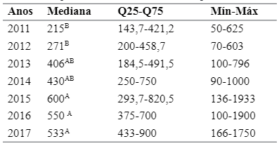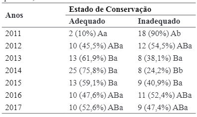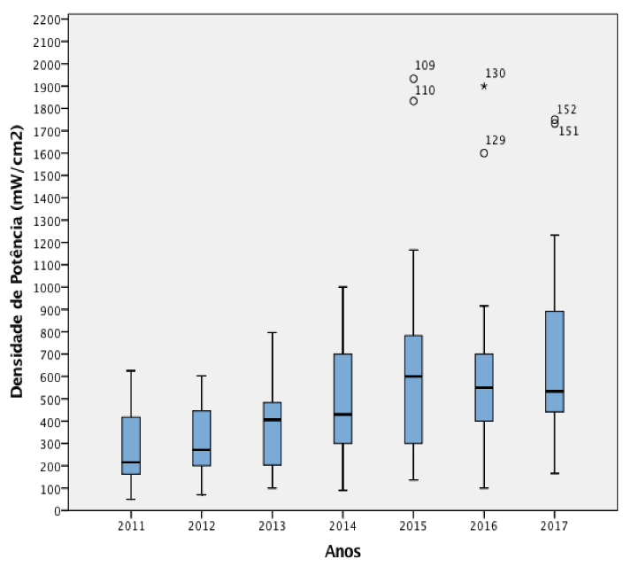 Diferenças estatisticamente significativas foram verificadas para os valores de densidade de potência entre os anos (p<0,0001, teste Kruskal-Wallis). Nas comparações aos pares (teste post hoc Dunn), os valores de densidade de potência para os anos 2011 (p<0,01) e 2012 (p<0,05) foram estatisticamente diferentes dos anos 2015, 2016 e 2017. As demais comparações aos pares foram estatisticamente semelhantes (p>0,05). A tabela 1 apresenta estatísticas descritivas para densidade de potência, representadas graficamente no Box-plot (Gráfico 1). A tabela 2 apresenta estatísticas descritivas para a variável estado de conservação, bem como resultados obtidos com o teste Qui-quadrado.