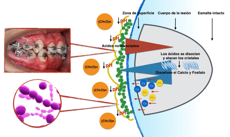 Las bacterias contenidas en el biofilm producen ácidos no disociados producto de la exposición a carbohidratos fermentables, disminuyendo el pH hasta alcanzar niveles críticos cercanos a 5,5 (4), los ácidos son capaces de difundirse dentro de la sub-superficie del esmalte a través de la película adquirida, disociándose y comenzando la desmineralización (figura 1).