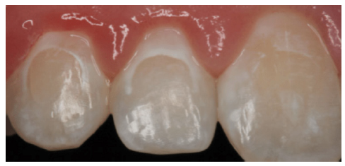 La disolución del contenido mineral de la estructura del esmalte crea una alteración en el índice de refracción de la luz, lo que clínicamente se presenta como una opacidad blanco lechosa sobre la superficie del esmalte (5). Las LMB pueden remineralizarse y regresar a la normalidad, permanecer estable o progresar hacia la cavitación dependiendo del medio ambiente oral (6). Estas se pueden observar luego de un mes de haber cementado los aparatos ortodónticos fijos (3). Después del tratamiento, las LMB disminuyen dentro de los dos primeros años, pero pueden continuar siendo un problema estético que afecta a los pacientes luego del tratamiento ortodóntico (figura 2) (7).