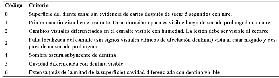 El sistema de detección y evaluación internacional de caries o ICDAS por sus siglas en inglés fue desarrollado en 2003 y luego modificado a ICDAS II en 2007, se trata de un índice visual de detección de caries; su ventaja es que permite una mejor categorización de las lesiones de desmineralización inicial del esmalte (34,35). Esto es particularmente importante para las LMB debido que, al tratarse de lesiones iniciales de caries, requieren criterios más rigurosos para su identificación y diferenciación. Los códigos y criterios de clasificación pueden ser observados en la tabla 1.