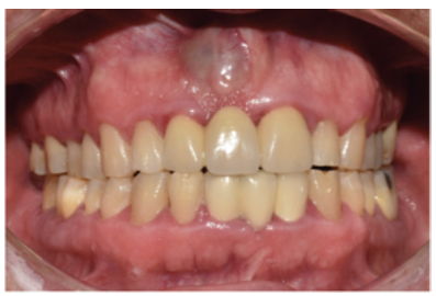 Paciente de sexo masculino de 59 años de edad, acudió al Servicio de Cirugía Oral y Maxilofacial del Centro Dental Docente de la Universidad Peruana Cayetano Heredia, por presentar una lesión nodular en región antero superior en la maxila, con un tiempo de enfermedad de 1 mes, de inicio insidioso y curso progresivo, asintomático. Refirió además que fue sometido a exodoncia simple en la misma región hace 10 meses sin complicaciones aparentes.