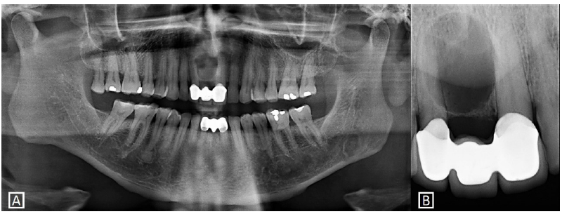 Abstract: The residual cyst is a result of remnant periapical inflammatory tissue produced by tooth extraction without a thorough curettage. It mainly affects males and the maxilla. Its diagnosis depends on the clinical, radiographic and histopathological examination findings. The present case aims to report the case of a residual cyst in the anterior region on the maxilla of the oral cavity in an adult patient of the Centro Dental Docente Cayetano Heredia with a history of dental extractions in the lesion area of 10 months ago. An enucleation was performed and a sample was taken for the pathological examination, which subsequently confirmed the diagnosis of residual cyst.