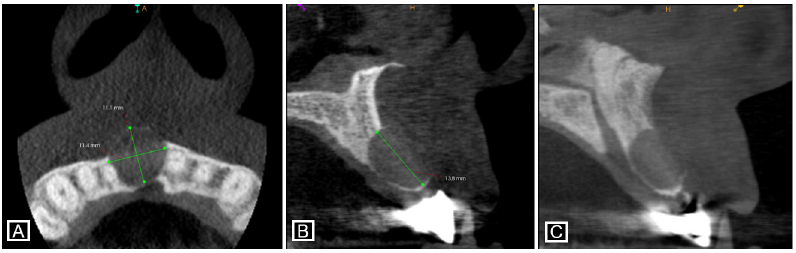 En la radiografía panorámica se observó una imagen radiolúcida proyectada en el proceso dentoalveolar en zona de pieza 11 alcanzando la cima del reborde alveolar y extendiéndose hasta las superficies radiculares de las piezas 12 y 21. En la radiografía periapical se comprobó la presencia de la cortical fina en los bordes y se visualizó la continuidad del espacio para el ligamento periodontal de las piezas 12 y 21 (figura 2). En la TCHC, se comprobó la proximidad con el conducto nasopalatino y la expansión, adelgazamiento y erosión de la tabla ósea vestibular (figura 3). Dadas las características imagenológicas las opciones diagnosticas podrían ser: Ameloblastoma Uniquístico, Queratoquiste Odontogénico, Quiste Óseo Simple o Quiste Residual.