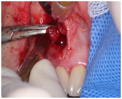 Se procedió a realizar la enucleación del quiste en la cual se realizó la toma de muestra, osteotomía periférica, curetaje, lavado con NaCl 0.9%, sutura y colocación de apósito (figura 4). El resultado del análisis anatomopatológico ratificó el diagnóstico de Quiste Residual.