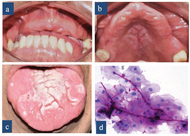 Sobre la base de las características clínicas se plantearon los diagnósticos de leucoplasia homogénea y candidiasis hiperplásica crónica. Para establecer el diagnóstico definitivo se realizó un frotis y se tomó una biopsia de una protuberancia blanquecina. El frotis teñido con PAS demostró la presencia de hifas y blastosporas de candida (figura 1 (d)).