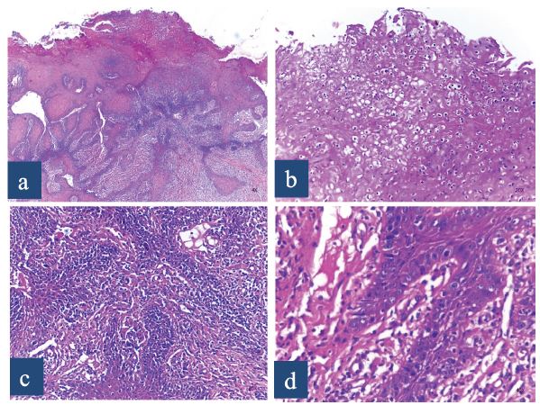 El examen histopatológico mostraba marcado engrosamiento del epitelio, por incremento del número de las capas superficiales, las células mostraban vacuolización y no existían células queratinizadas ni paraqueratinizadas (figura 2 (a y b)). Se distinguía marcada hiperplasia pseudoepiteliomatosa, las crestas epiteliales eran delgadas y profundas con hipercelularidad (figura 2 (b y c)). En las capas basal y parabasal se observaban células con hipercromatismo nuclear y algunas mitosis anormales (figura 2 (d)). La lámina propia presentaba severo infiltrado inflamatorio linfoplasmocitario.