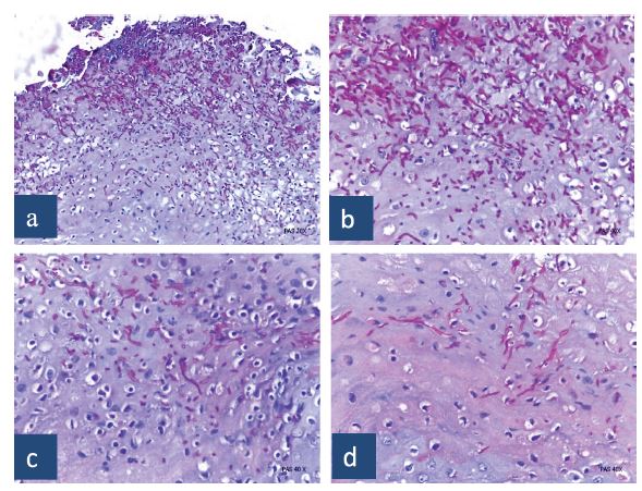 Los cortes histológicos teñidos con PAS demostraron la presencia de hifas y blastosporas de candida en los diferentes estratos del epitelio. La concentración del hongo fue mayor en el tercio superior, escaso en el tercio medio y mínima en el tercio inferior del epitelio (figura 3 (a, b, c y d). No se observaron hifas en la capa basal ni parabasal. Los hallazgos histopatológicos establecieron el diagnóstico de CHC.