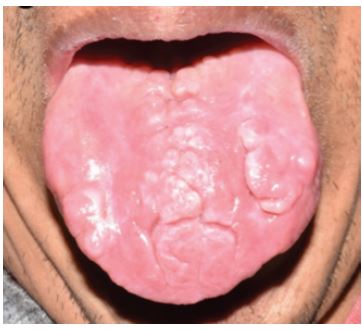En la zona central del dorso de la lengua se apreciaba una placa amplia, de color blanco, con fisuras que surgían de la línea media, dividiéndola en varias protuberancias (figura 1 (c)). En las zonas laterales existían pequeñas pápulas blanquecinas. El resto del dorso lingual presentaba atrofia de papilas filiformes. Ninguna área blanca se desprendía al ser raspada con baja lengua.