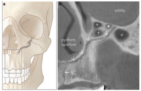 1a: Ilustración esquemática del canal sinuoso que se origina en el canal infraorbitario y se dirige hacia la apertura piriforme. 1b: CBCT: puntas de flecha: canal sinuoso, AC: Canal accesorio del CS, * conducto infraorbitario, +: bahías seno maxilar. (S. L. Thomas von Arx, «Anterior superior alveolar nerve (ASAN) A morphometric-anatomical analysis,» SWISS DENTAL JOURNAL, vol. SSO125: 1202–1209, (2015).)