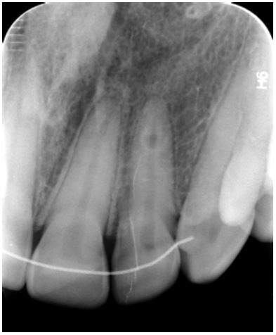 Como antecedente clínico el paciente relata haber estado bajo tratamiento ortodóncico fijo por 6 meses el año 2018 donde la radiografía panorámica solicitada para el estudio no presentaba alteración en la zona de interés. Con este informe el paciente es derivado con la endodoncista del centro, quien sospecha de una endorrizálisis e indica que el tratamiento estándar para dicho cuadro es el tratamiento de conducto.