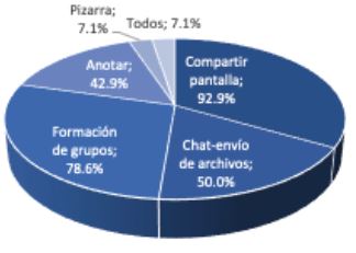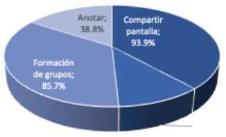 En cuanto a las herramientas más útiles de la plataforma Zoom, el 92,9% de los docentes consideraron que era el compartir pantalla, seguido por el de formación de grupos en un 78.6%, el envío de archivos a través del chat con un 50%, el 42,9% considera a la herramienta anotar (gráfico 5). En el caso de estudiantes el 93,9% considera que compartir pantalla era la herramienta más útil del Zoom, seguido también por la formación de grupos en un 85,7%, la herramienta anotar con un 38,8% y el envío de archivos en un 26,5% (gráfico 6).