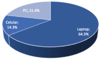 Los dispositivos que más utilizan los docentes para conectarse son: laptop en un 64,3%, seguido de una computadora personal (PC) con un 21,4% y el 14,3% utilizo con mayor frecuencia el celular para conectarse (gráfico 7).
