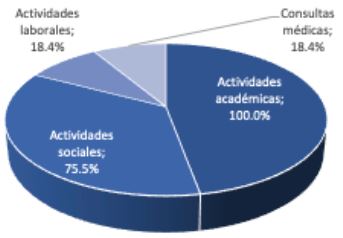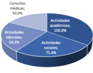 Tanto los docentes como los estudiantes utilizaron la plataforma de vídeo conferencia para actividades académicas, sociales, laborales y consultas médicas: el 100% de los docentes y estudiantes lo utilizaron para actividades académicas, en relación al uso en actividades sociales el 71,4% de docentes señaló que lo utilizaba para este fin, frente al 75,5% en el caso de estudiantes. En cuanto a las actividades laborales el 64,3% de los docentes utilizaron la plataforma de vídeo conferencia frente al 18,4% de los estudiantes y para consultas médicas; como era de esperarse, el 50% de los docentes manifestó que utilizo la plataforma de video conferencia para una consulta médica versus el 18,4% de los estudiantes (gráfico 3 y gráfico 4).