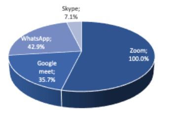 En relación a las plataformas de vídeo conferencias utilizada alguna vez por los docentes se encontró que el 100% de los docentes que contestaron la encuesta han utilizado la plataforma zoom, seguido del aplicativo WhatsApp con un 85,7%, el uso de Google meet está en un 42,9% y otras plataformas como Skype, Facetime y Microsoft team en menor porcentajes (gráfico 1). El comportamiento de los estudiantes fue similar encontrándose que el 100% ha usado la plataforma Zoom, seguido del aplicativo WhatsApp con un 71,4%, Google meet con un 38,8% y las otras plataformas en menor porcentajes (gráfico 2).