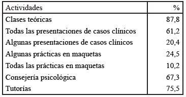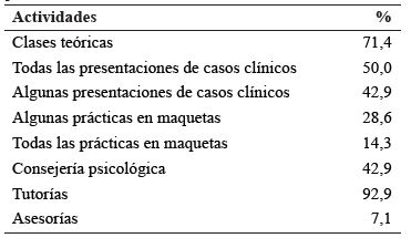 Adicionalmente se les preguntó sobre las actividades que consideran que debe mantenerse a través de la plataforma Zoom cuando se retorne a la presencialidad y en opinión de los estudiantes el 87,8% considera que las clases teóricas deben mantenerse a través del Zoom, seguido por las presentaciones de casos clínicos con un 61,2%, el 75,5% consideró que las tutorías deben seguir realizándose vía Zoom, y el 67,3% para la consejería psicológica (tabla 1). En este mismo punto el 71,4% de los docentes que respondieron a la encuesta consideraron que las clases teóricas deben mantenerse utilizando la plataforma Zoom, el 92,5% para las tutorías, seguido por un 50% que considera que para todas las presentaciones de caso deben continuar a través de la plataforma Zoom, el 42,9% para la consejería psicológica (tabla 2).