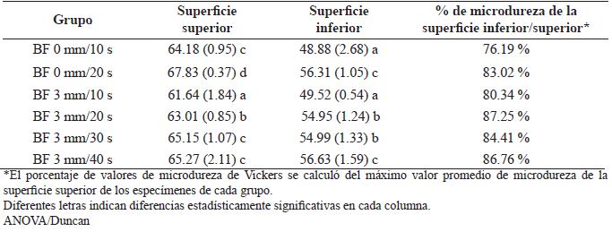 En la superficie superior de las muestras, se observó que los mayores valores de microdureza se encontraron en el grupo BF 0 mm/20 s, seguido por BF 3 mm/30 s y BF 3 mm/40 s (p<0,05). No se encontraron diferencias significativas entre los grupos BF 3 mm/30 s y BF 3 mm/40 s (p>0,05). Los menores valores de microdureza se observaron en el grupo BF 3mm/10 s y BF 3 mm/20.