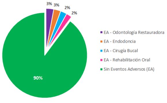 En el campo endodóntico, Tafur et al., evaluaron la prevalencia y origen de los eventos adversos en pacientes que fueron atendidos en el servicio de endodoncia de una universidad privada de Colombia durante los años 2007 y 2008 (32), para ello, analizaron 464 historias clínicas en las que se detectaron eventos adversos asociados al tratamiento pulpar. Los autores encontraron un 74% de eventos adversos, de los cuales, el 81% fueron previsibles durante la apertura cameral, 36% durante la preparación biomecánica y 60% durante la obturación de conductos, siendo la “perforación”, “transportación” y “sobreobturación” los más prevalentes, respectivamente. Estos resultados se complementan a lo evidenciado en la presente investigación, donde se resalta a la “Sobreobturación o subobturación con sintomatología”, “Ulceración/ irritación de mucosa bucal por irrigante”, “Fractura coronaria post tratamiento endodóntico” y “Separación de instrumental endodóntico” como los principales eventos adversos. Se reafirma que el área de endodoncias presenta una alta frecuencia de eventos adversos, pero estos, se pueden prevenir desde el diagnóstico y perfeccionamiento de los procedimientos del tratamiento. Por tanto, los autores concluyen que es necesario implementar mecanismos de seguimiento y control para identificar las causas y mitigarlas (32).