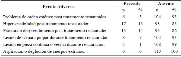 Se encontró que, en cuanto a la ocurrencia de eventos adversos durante los tratamientos de odontología restauradora (operatoria dental) o después de haber ejecutado estos, ocurrieron un total de 42 casos, de los cuales el evento adverso más frecuente fue la “Hipersensibilidad post tratamiento restaurador” con 17 casos (15%), seguido de “Fractura o desprendimiento post tratamiento restaurador” con 15 casos (14%) y de “Lesión de cámara pulpar durante tratamiento restaurador” con 8 casos (7%). Se reportaron ocho casos con “Lesión de cámara pulpar durante tratamiento restaurador” (7%), seis casos con “Problema de orden estético post tratamiento restaurador” (5%), dos casos de “Lesión en pieza continua o vecina durante restauración” (1%) y ningún caso de “Aspiración o deglución de cuerpos extraños” (0%) (tabla 1).