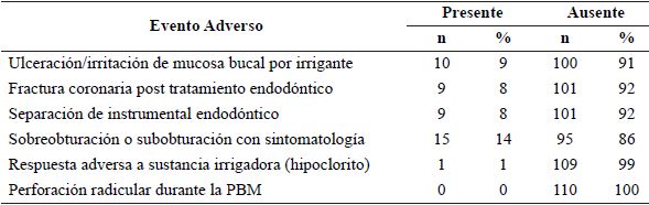 En relación con los eventos adversos en tratamientos pulpares (endodoncia), se reportaron 44 casos, de los cuales, el principal fue “Sobreobturación o subobturación con sintomatología” con 15 casos (14%), seguido de “Ulceración/irritación de mucosa bucal por irrigante” con 10 casos (9%) y nueve casos de “Fractura coronaria post tratamiento endodóntico” y de “Separación de instrumental endodóntico”, cada uno representando un 8%. Se reportó sólo un caso de “Respuesta adversa a sustancia irrigadora (hipoclorito)” (1%) y ningún caso de “Perforación radicular durante la preparación biomecánica” (0%) (tabla 2).
