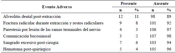 En cuanto a los eventos adversos que se presentaron en los tratamiento de cirugía bucal (exodoncias), estos representaron un total de 40 casos, siendo el más prevalente la “Alveolitis dental post-extracción” con 12 casos (11%), seguido de “Fractura radicular durante extracción y restos radiculares” con 9 casos (8%) y “Sangrado excesivo post-cirugía” con 7 casos (6%). Adicionalmente se reportaron cinco casos de Hematoma post-quirúrgico (4%), cuatro de “Parestesia por lesión de las ramas terminales del nervio” y tres de “Comunicación bucosinusal” (2%) (tabla 3).
