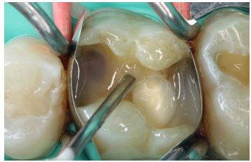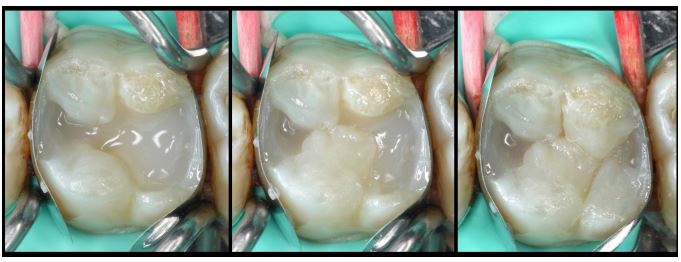 Bajo aislamiento absoluto con goma dique, utilizando un sistema de banda matriz metálica pre- contorneada sujetas con cuñas de madera y anillos metálicos de sección circular (Quickmat DELUXE, Polydentia, Switzerland), se procedió a realizar protección pulpo-dentinaria con ionómero de vidrio modificado por resina (Riva light cure HV, SDI, Australia) solamente en la caja distal en la cual se observaba mayor profundidad y cercanía al complejo pulpar.