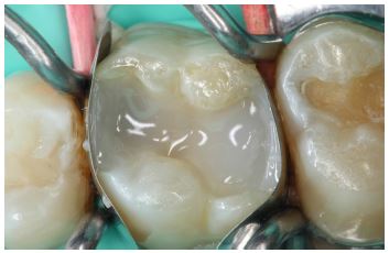 Se presenta a la clínica privada de uno de los autores un paciente de género masculino de 35 años de edad que presenta una amalgama mesio-ocluso-distal en el diente 26 con claros signos de microfiltración, creep, corrosión y pérdida de morfología oclusal en estado “Charlie” de acuerdo a los criterios clínicos de Ryge/USPHS modificados del Servicio de Salud Pública de los Estados Unidos (figura 1).