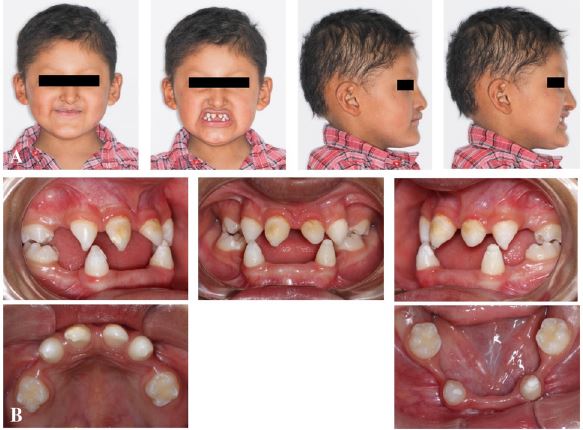 Resumen: La displasia ectodérmica hipohidrótica (DEH) es un trastorno genético que afecta el desarrollo de los tejidos ectodérmicos. Se realiza el reporte de caso de un paciente masculino de 5 años, con características clínicas extra e intraorales de DEH. El examen clínico intraoral reveló una ausencia generalizada de dientes, la radiografía panorámica reveló la presencia de primeros molares permanentes con taurodontismo y confirmó la oligodoncia. El análisis cefalométrico reveló una relación esquelética de clase III, debido a la deficiencia en el desarrollo sagital del maxilar y una tendencia de crecimiento en sentido antihorario. Las alteraciones en el desarrollo craneofacial requieren un tratamiento multidisciplinario y un seguimiento a largo plazo para controlar el crecimiento craneofacial.