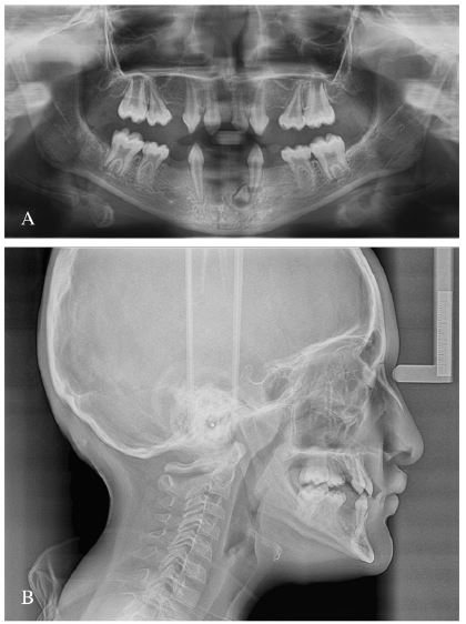 Panoramic X-ray confirmed oligodontia of deciduous and permanent teeth. Permanent first molars close to the dental eruption with alteration of the shape of the pulp chamber, typifying taurodontism. Additionally, a dental germ was observed apical to tooth 7.3 (figure 2 (A)). The lateral skull radiography (figure 2 (B)) allowed a cephalometric analysis, including the cephalometric measurements used by the American Association of Orthodontics. A class III skeletal relationship was observed, due to maxillary deficiency (ANB = -5º, angle of convexity = -14º; SNA = 74º), with a slightly counter clockwise growth tendency (Y-axis = 59º; Sn.GOGn = 28º; FMA = 23º). The inter-incisor relationship could not be assessed due to the absence of the lower anterior teeth (table 1).