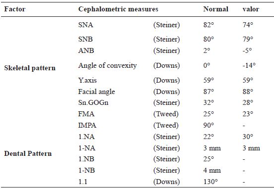 ED is a rare genetic disorder with a large number of alterations including those related to the growth and development of the jaws and dental structures (7,8,11). In the present case, the multiple absence of deciduous and permanent teeth characterized a oligodontia; accompanied by an alteration in the shape of the anterior teeth, which coincides with findings described in the literature (2,4). HED is the most common form of ED and is mainly associated with the EDA gene, located on the long arm of the X chromosome (Xq12-q13.1), followed by the EDAR and EDARADD genes; these genes regulate the expression of proteins such as ectodysplasin A, which plays an important role in the development of ectodermal structures in the embryonic stage (2,9). Bergendal et al., performed genetic studies on a series of 7 cases of patients with signs of ectodermal alterations, finding that in all cases were a biallelic mutation of the WNT10A gene, resulting in C107X and F228L, being a predictor of the alterations of dental shape and oligodontia (8). Although, in the patient presented in the case report it was not possible to perform the genetic study, the clinical and radiographic characteristics reasonably allow us to suspect underlying mutations of the WNT10A gene. Doğan et al., evaluated the cephalometric characteristics of a series of 12 patients with a diagnosis of EDH, and found that a class III skeletal relationship with sagittal deficiency of the maxilla and mandibular rotation in a clockwise direction are common features (7). In this case report, it was observed that the values for these cephalometric magnitudes were compromised. Furthermore, these findings seem to be a constant in patients with EDH. The characteristic alterations of EDH at the level of the glandular tissue can reach the normal functioning of the salivary glands (2,3), promoting a reduction in the salivary flow, which can be present in 30.2% of the cases (11). Gomes et al., (9) showed that HED patients have a high risk of developing dental caries and susceptibility to opportunistic diseases, due to the reduction in salivary flow; especially when it was less than 1 mL/mim. In the case presented, the salivary flow was 0.7 mL/min, a value below 1.2 mL/mim (considered as a normal stimulated salivary flow), so it was necessary to indicate the use of an oral lubricant based on malic acid and xylitol (Xeros Dentaid®) and improvement in oral hygiene behavior, accompanied by oral physiotherapy.