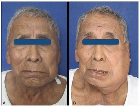 Paciente masculino de 73 años de edad, con antecedentes de diabetes mellitus tipo II, sin alergias a medicamentos, el cual es referido al Hospital Regional General Ignacio Zaragoza ISSSTE CDMX, con aumento de volumen en región mandibular del lado izquierdo (figura 1 (A)) con limitación de la apertura oral, edentulismo parcial, úlcera crónica de dos años de evolucion en encía de reborde alveolar posterior del lado izquierdo (figura 2 (A)). En los estudios de imagen se observa una lesión osteolítica infiltrante a hueso medular, con bordes irregulares de aproximadamente 4 cm x 2 cm y destrucción de corticales que deja únicamente borde basal en cuerpo mandibular del lado izquierdo (figura 3 (A y B)). Tras el diagnostico por biopsia incisional de carcinoma epidermoide, se decide en conjunto con el servicio de oncología quirúrgica efectuar resección de tumor con márgenes de seguridad, disección selectiva de cuello y reconstrucción mandibular mediante placa de reconstrucción 2.4 con cóndilo y rotación de colgajo miocutáneo de pectoral mayor.