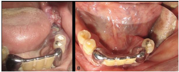 Lesión en region de trígono retromolar izquierdo, ulcerada con bordes indurados, contenido fibrótico. Injerto cutaneo a cinco meses postquirúrgicos, con adecuado proceso de cicatrizacion