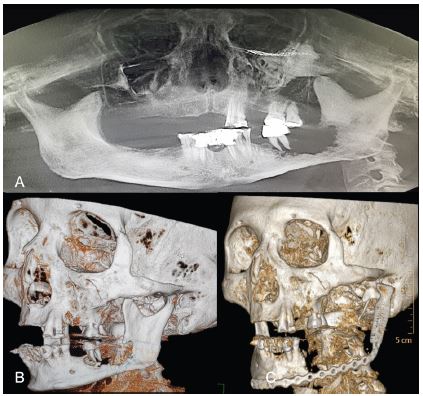 Ortopantomografía que muestra lesión osteolítica, radiolúcida en región de cuerpo mandibular izquierdo. Reconstrucción en 3D de TC prequirúrgica, en la que se observa destrucción ósea a nivel de cuerpo mandibular. Reconstrucción 3D de TC postquirúrgica. Se observa placa de reconstrucción en posición y función.