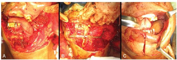 A) Defecto tras la hemimandibuelectomía izquierda. B) Placa de reconstruección fija, con el colgajo medial a ella y con la paleta cutánea suturada a piso de boca. C) Sutura de la paleta cutánea intraoralmente y puntos de referencia en vermellon de labio y region mentoniana.