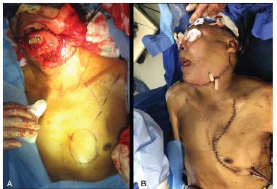 A) Marcaje transoperatorio de colgajo de pectoral mayor con paleta cutánea. B) Cierre de heridas faciales, cervicales y torácicas en el postquirúrgico inmediato.