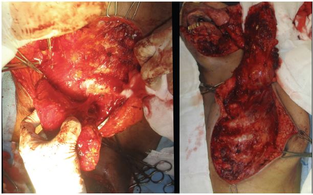 Una vez realizada la resección quirúrgica, es importante la reconstrucción de los tejidos duros y blandos, en este caso vascularizado miocutáneo de pectoral mayor. A pesar de la llegada de injertos de tejido libres vascularizados, el colgajo pectoral mayor miocutáneo (pectoralis major myocutaneous, PMMC) sigue siendo un colgajo pediculado ampliamente utilizado para la reconstrucción de defectos de tejidos blandos en la región oral y maxilofacial. Los colgajos de PMMC se desarrollaron originalmente en 1947 para la reconstrucción de defectos del tejido cardiotorácico (8).