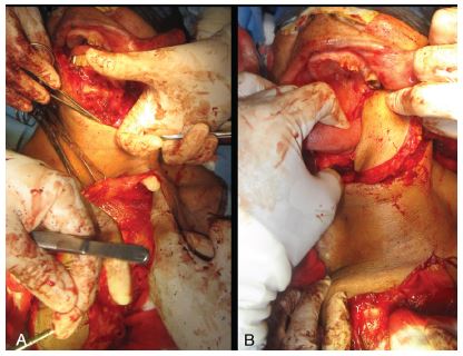 A) Colgajo del musculo pectoral mayor disecado con su paleta cutánea y tunelización cervical. B) Se observa cómo el colgajo es pasado a través del tunal cutáneo y es presentado en el defecto mandibular.