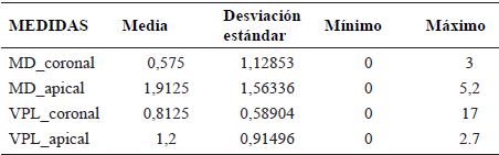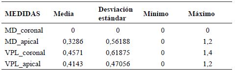 La guía quirúrgica con modificación del cabezal del micromotor muestra valores menores en sus desviaciones a nivel coronal y apical (figura 6 y tabla1).