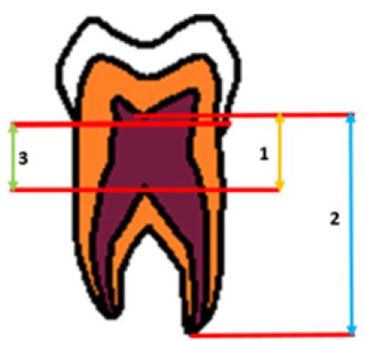 Un primer estudio clasificó al taurodontismo en Hipo, Meso e Hipertaurodontismo basado en mediciones subjetivas según la extensión hacia apical del piso de la cámara pulpar el cual podía ser menor o mayor (2,12). Sin embargo, Shifman y Chanannel lo clasificaron más objetivamente mediante un método en el cual consideraban tres variables: la altura de la cámara pulpar (Distancia 1), la longitud que existe entre el punto más apical del techo de la cámara pulpar y el ápice de la raíz más larga (Distancia 2), y la longitud entre la línea que conecta las dos uniones cemento adamantinas (UCA) y el punto más superior en el piso de la cámara pulpar (Distancia 3) el cual debe ser mayor a 2,5 mm para que un diente sea considerado taurodóntico. Para hallar el índice taurodóntico dividieron la altura de la cámara pulpar entre la distancia que existe entre el punto más apical del techo de la cámara pulpar y el ápice de la raíz más larga y lo multiplicaron por 100, y según el valor resultante lo clasificaron en hipotaurodontismo si era de 20-29%, mesotaurodontismo de 30-39% e hipertaurondontismo de 40-75% (1-3, 13,14,15,16). Compararon la distancia 3 con el índice taurodóntico, y determinaron diente con hipotaurodontismo al que se encontraba en un rango entre 2,5 y 3,7mm, mesotaurodontismo entre un rango de 3,7 a 5,0 e hipertaurodontismo entre 5,0 y 10 (11,14).