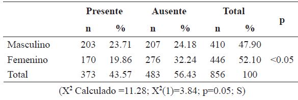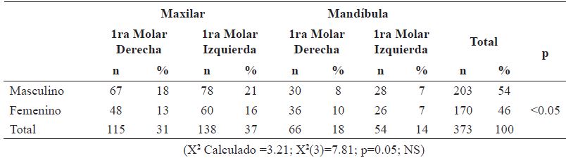 De acuerdo a la frecuencia de taurodontismo según sexo, se evidenció 373 molares afectadas con esta anomalía que tuvo mayor frecuencia en hombres, con 203 molares el cual representó el 23.71%, y en menor frecuencia en mujeres con 170 molares que representó el 19.86%. La comparación de la distribución entre la presencia de taurodontismo y el sexo se realizó mediante prueba x2, la cual concluyó que, si existe una asociación estadísticamente significativa, por lo que es más probable que un hombre presente Taurodontismo que una mujer (tabla 2).