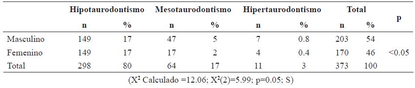 En cuanto al tipo de taurodontismo según la clasificación de Shifman y Chanannel de acuerdo al sexo, el hipotaurodontismo se evidenció en el 80% de los primeros molares, siendo 149 que les pertenecieron a hombres y 149 a mujeres el cual representó 17% en ambos sexos. El mesotaurodontismo se evidenció en 17% de los primeros molares, siendo 47 de hombres que correspondió al 5% y 17 de mujeres que correspondió al 2%. El hipertaurodontismo se observó en 3% de los primeros molares siendo 7 de hombres que representó el 0,8% y 4 de mujeres que representó el 0,4% (tabla 3).