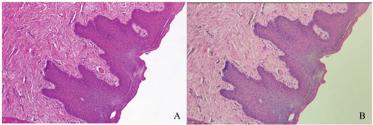 Comparación de microfotografías de hiperplasia fibrosa (tinción hematoxilina y eosina, magnificación 10X).