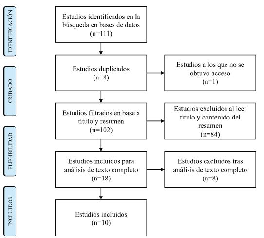 Luego de la búsqueda inicial y eliminación de duplicados se identificaron 102 artículos, tras un filtro según título y resumen se eliminaron 84, al no ser relevantes con nuestro objetivo. Los resultados de la búsqueda se detallan en el diagrama de flujo adaptado y traducido del protocolo PRISMA para revisiones sistemáticas (6) (figura 2).